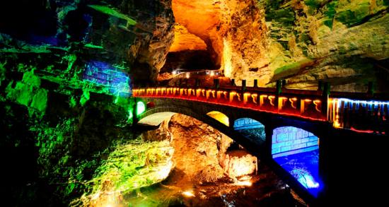 黃龍洞位于索溪峪東面,被稱(chēng)為“地下魔宮”,洞口霧靄迷漫,洞內(nèi)長(zhǎng)廊蜿蜒,鐘乳懸浮,石柱石筍林立,還有石簾、石幔、石花、石琴,琳瑯滿(mǎn)目,異彩紛呈,令人目不暇接?!岸赐舛础?、“樓外樓”、“天外天”、“山外山”,盤(pán)根錯(cuò)節(jié)。黃龍洞內(nèi)可分四層,水陸并進(jìn),從最低陰河至最高穹頂,垂直高度差有100多米,洞內(nèi)有一個(gè)水庫(kù)(黃龍水洞)、二條陰河(響水河、水晶河)、三個(gè)地下瀑布(黃龍瀑、天水瀑、天地瀑)、四個(gè)水潭、十三個(gè)廳(宮)(龍舞宮、水晶宮、迷人宮……)、九十六條游廊,長(zhǎng)度約達(dá)15公里,最大的廳堂有12000平方米,可容納萬(wàn)人。真可謂是洞中乾坤大,地下有洞天。入黃龍洞,如入人間仙境一般。