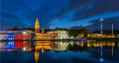 人類文明河,這里將世界上七處著名的景觀以微縮的方式匯集在河中,用長流不息的河水寓意人類文明的源遠流長。最近的一處景觀是法國四大洲噴泉,噴泉通過頂部歐、亞、非、美四位女性雕像和底部的駿馬、海豚表現(xiàn)了四大洲人民的團結向上和友誼,具有強烈的和平主義精神和時代感。從這里向遠處看,成白色貝殼狀的是澳大利亞悉尼歌劇院。緊挨著的是建在新加坡安德遜橋畔的魚尾獅,在魚尾獅旁邊的是美國自由女神像。在人類文明河的上游是埃及金子塔和其守護之神司芬克斯獅身人面像。河內還有秘魯復活節(jié)島巨人頭像,面北朝南。